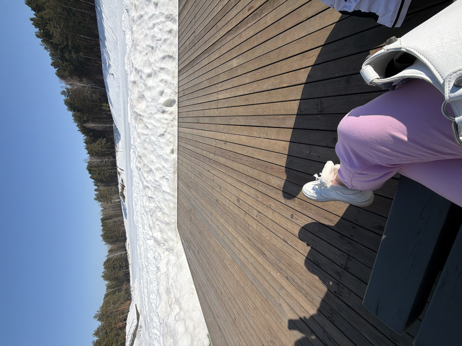 The image depicts an outdoor winter or early spring scene in Naberezhnye Chelny, Russia. In the immediate foreground, a person's lower body is visible, seated on a dark-colored bench. The individual wears light pink trousers and white athletic shoes with white faux fur lining around the ankles. A white bag with a visible grey strap is positioned to the right of the person's right leg. Long shadows, indicative of a low sun angle from the left, are cast across the wooden deck, including one suggesting a person holding a mobile device. The central part of the image features a wide wooden deck constructed from parallel planks, extending from the foreground towards the background. Beyond the deck, a substantial bank of uneven, partially melted snow forms a prominent barrier. In the background, a dense forest covers a rising hillside, consisting primarily of dark green coniferous trees interspersed with bare deciduous trees. A set of steps or a ramp structure on a snowy slope is partially visible in the far left background, descending towards the snowy expanse. The sky above is clear and bright blue.