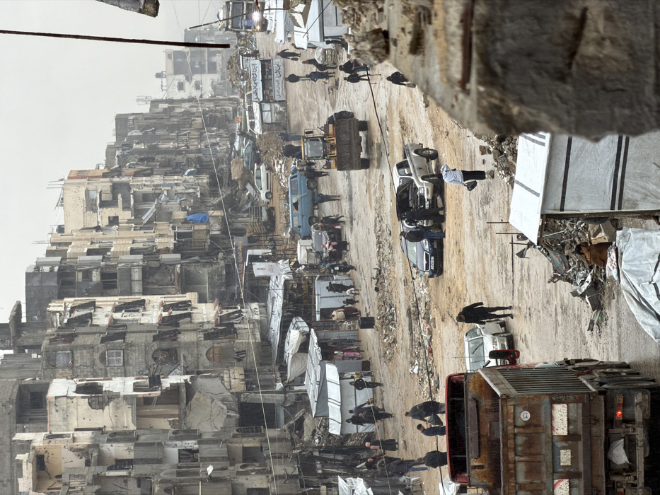 The image depicts a heavily damaged urban street scene in Gaza, Palestinian Territory, under an overcast sky. The long street, appearing wet and muddy with significant rubble and debris, recedes into the distance, flanked by numerous multi-story residential or commercial buildings. These structures exhibit extensive destruction, including large holes, pockmarks, missing facades, shattered windows, and exposed interiors, indicating severe structural compromise. Many windows are boarded or covered with tarps. In the midground, a diverse collection of vehicles populates the street. A yellow front-end loader or bulldozer is visible in the center, facing away from the viewer. To its right, a white pickup truck has its hood open, attended by at least two individuals, with a dark sedan parked nearby. A blue van and other cars are present further down the street. In the foreground on the left, the rear of a large, rusty red dump truck with a raised bed is prominent. Numerous pedestrians, including men, women, and children, are seen walking along the wet road, congregating near makeshift stalls or shelters constructed from corrugated metal and tarps that line the street. Piles of rubble and trash are scattered across the ground. A person sits on a pile of concrete debris in the bottom right foreground. The overall environment conveys a sense of ongoing disruption and recovery efforts within a severely damaged urban landscape.