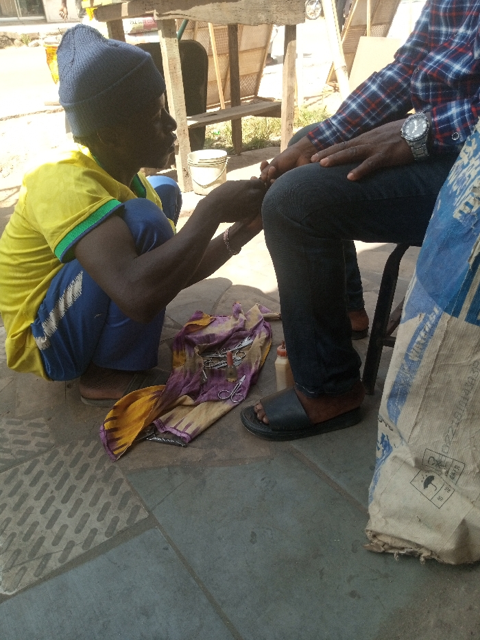The scene is an outdoor setting in Maiburiji, Nigeria. Two individuals are present on a tiled ground surface. On the left, a dark-skinned individual, wearing a blue beanie, a yellow and green short-sleeved shirt, and blue pants, is squatting. This individual's hands are engaged with the left hand of a second dark-skinned individual. The second individual is seated on a dark chair to the right, wearing a red, white, and blue plaid long-sleeved shirt, dark blue jeans, and black slide sandals. A silver-colored watch is visible on the client's left wrist. Between the two individuals, a multicolored fabric cloth (purple, yellow, and black pattern) is laid on the ground, holding several metallic manicure tools, including multiple scissors and cuticle pushers, along with a small glass bottle. A light-colored plastic bottle is also on the ground nearby. In the background, a rustic wooden structure is visible, and further back, a white plastic bucket. To the far right of the frame, a large, partially visible light-colored sack with blue markings and an umbrella symbol is present. The ground consists of grey tiles, some with a textured pattern.