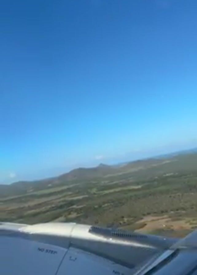 n aerial view from the window of an airplane. A vast landscape of green and brown fields stretches out below, with a range of mountains visible in the distance. The ocean can be seen at the edge of the horizon. The wing of the plane, with the words "NO STEP" printed on it, is in the foreground. The sky is a clear, bright blue.