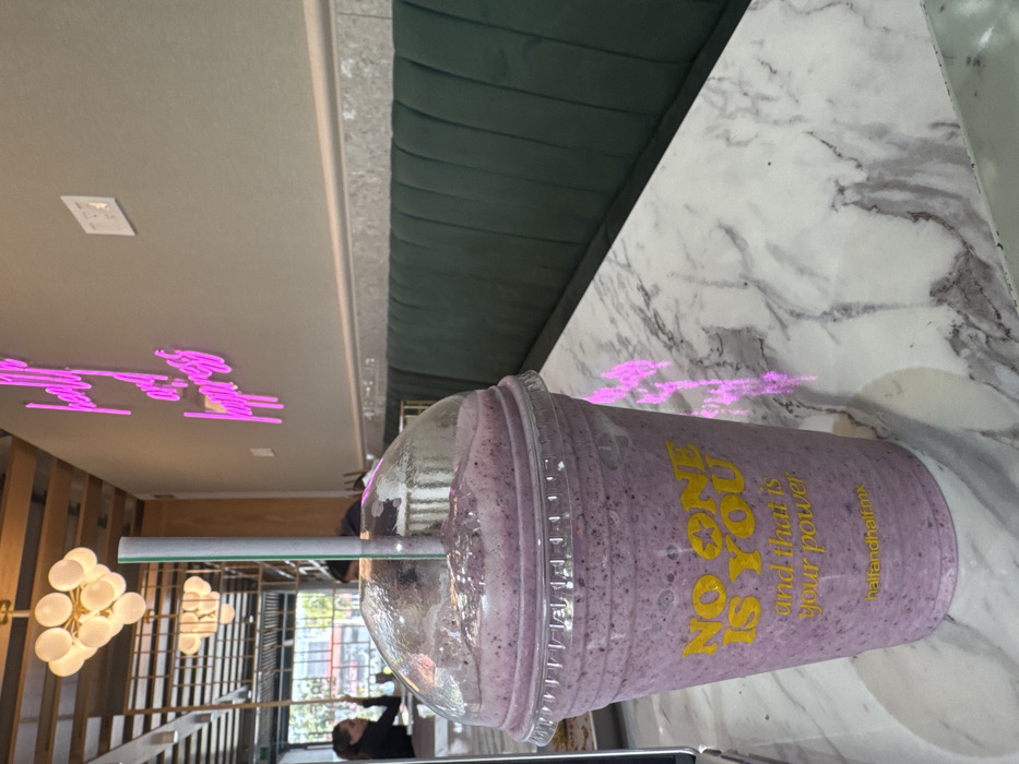 The image depicts the interior of a Half & Half establishment in Mexico City, Mexico. A large, clear plastic cup containing a purple smoothie or shake with a white foam top is positioned on a white marble-patterned table. The cup features a clear dome lid with a green and white straw inserted and is branded with yellow text reading "NO ONE IS YOU and that is your power" followed by "halfandhalfmx." Pink neon reflections are visible on the table surface. The background shows a long, dark green upholstered booth running parallel to the table, against a light grey wall. A pink neon sign on the wall displays the words "health and happiness." Overhead, a wooden slatted ceiling is visible, featuring two prominent circular chandeliers with multiple spherical bulbs. To the left, through a large window or open area, an urban street scene is discernible with several indistinct individuals seated at outdoor or near-entrance tables. Additional patrons are partially visible further inside the establishment.