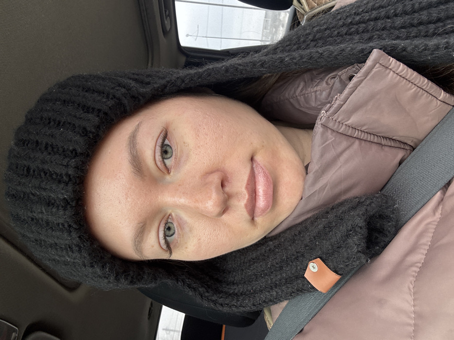 A woman is depicted in a close-up, selfie-style photograph taken inside a vehicle, located in Фролы, Russia. She has a fair complexion, light-colored eyes, and light pink lips, and is looking directly forward. The woman is wearing a dark, possibly black, ribbed knitted hat with earflaps, one of which features a brown, leather-like patch secured by a metal button. She is also clad in a muted pink or mauve puffer jacket, and a gray fabric seatbelt diagonally crosses her torso. The interior of the vehicle, including a light-colored headliner, is visible. Through the vehicle's window on the right, an outdoor scene under an overcast sky is visible, featuring utility poles and what appears to be a wintry or snowy landscape.