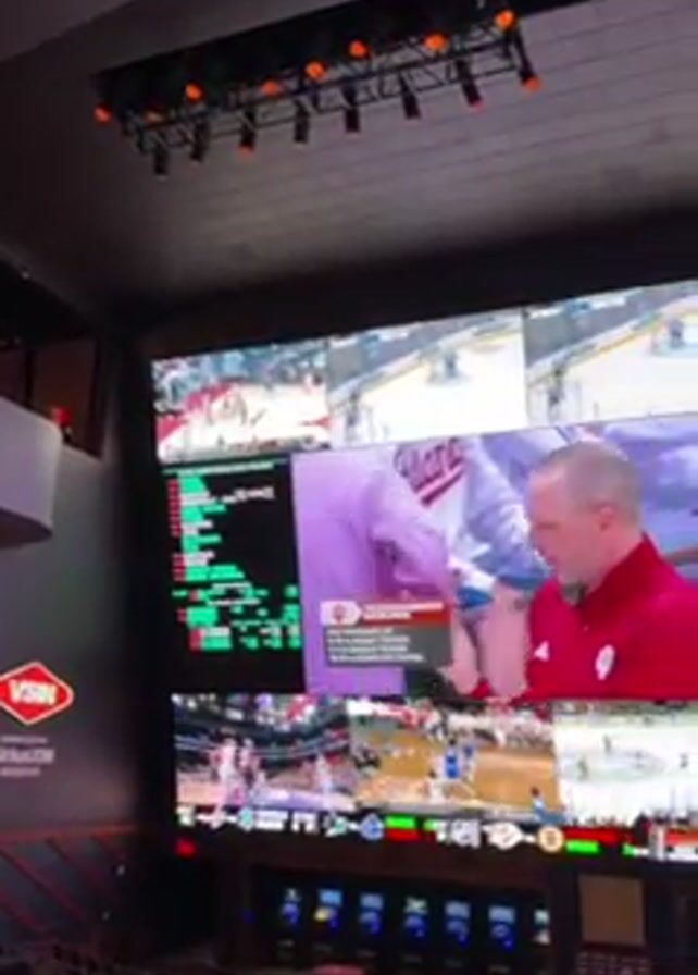 large sports betting venue with a massive video wall displaying multiple live sports feeds