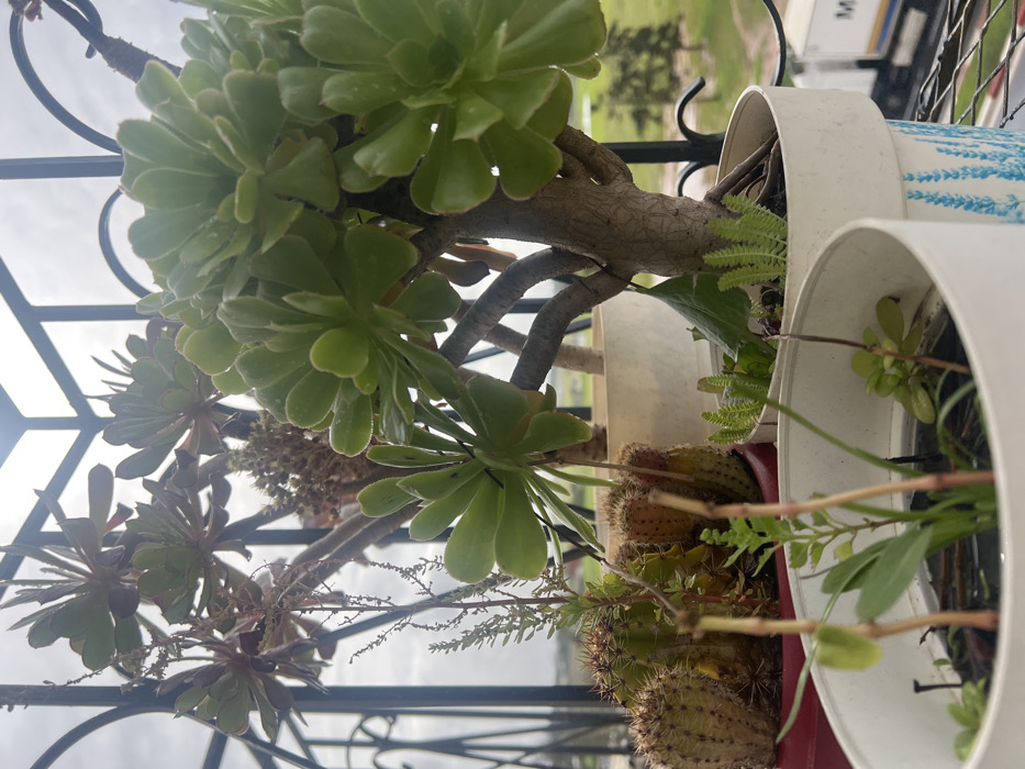 This image depicts a collection of potted plants situated on a balcony in Salé, Morocco. The scene is dominated by various succulents and cacti, arranged in white and red cylindrical pots. In the foreground, a white pot holds small, slender green plants and thin, dried stems. Immediately behind it and slightly to the right, a larger white pot with a blue floral pattern contains a substantial Aeonium succulent featuring multiple rosettes of thick, light green, paddle-shaped leaves on a woody, branched stem. To the left, a red pot houses several cacti, some displaying orange-red fruit-like growths, alongside other slender green plants. The plants are positioned in front of a black wrought iron balcony railing with scrolled details. Beyond the railing, the background reveals a hazy, overcast sky with a bright lens flare originating from the top center. The distant landscape includes indistinct green fields or undeveloped land with scattered trees. A road or track is visible in the lower right, where a portion of a white semi-trailer truck, marked with the letters "M A," can be seen. No human subjects or discernible actions are present.