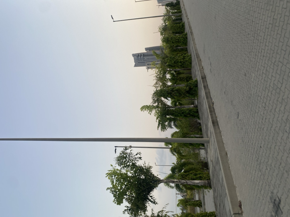A wide sidewalk paved with gray bricks dominates the right side of the image. A row of small trees and bushes lines the edge of the sidewalk, separating it from a street. Tall buildings stand in the background. Streetlights and tall poles are visible along the sidewalk. The sky is a pale blue and light yellow.