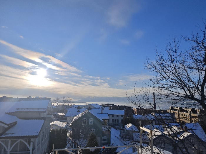 The image presents an elevated, panoramic view of a snow-covered urban area in Hamar, Norway, under a bright winter sky. The sun, positioned in the upper-left, emits a strong glare, creating a bright halo and iridescent effects within scattered clouds. The sky transitions from a vibrant blue on the right to a lighter, hazy white around the sun. In the foreground, the intricate, bare branches of a deciduous tree are visible on the far right, and metallic scaffolding components rise from the bottom center. The midground consists of numerous residential and commercial buildings, all featuring gabled roofs covered in a thick layer of white snow. Architectural styles vary, including traditional multi-story houses with ornate details and more modern, block-like structures. A prominent, tall industrial chimney stands vertically among the buildings in the right midground. The entire ground level within the cityscape is uniformly covered in snow. In the background, a large, calm body of water, presumably Mjøsa, stretches horizontally across the frame, with distant, snow-dusted mountains forming the horizon. No people or active elements are discernible within the scene.