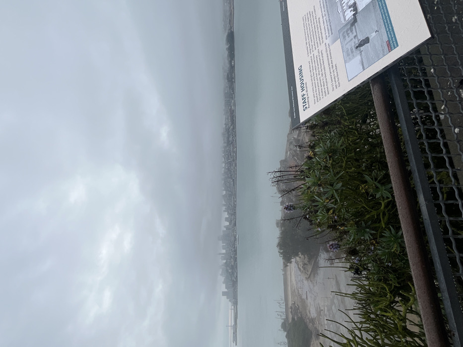 A misty view of San Francisco from Alcatraz Island. Fog obscures much of the city skyline. A plaque detailing the island's staff housing is visible on the right, surrounded by greenery and a metal railing. The water is gray and choppy, reflecting the overcast sky. The Golden Gate Bridge is faintly visible in the distance.