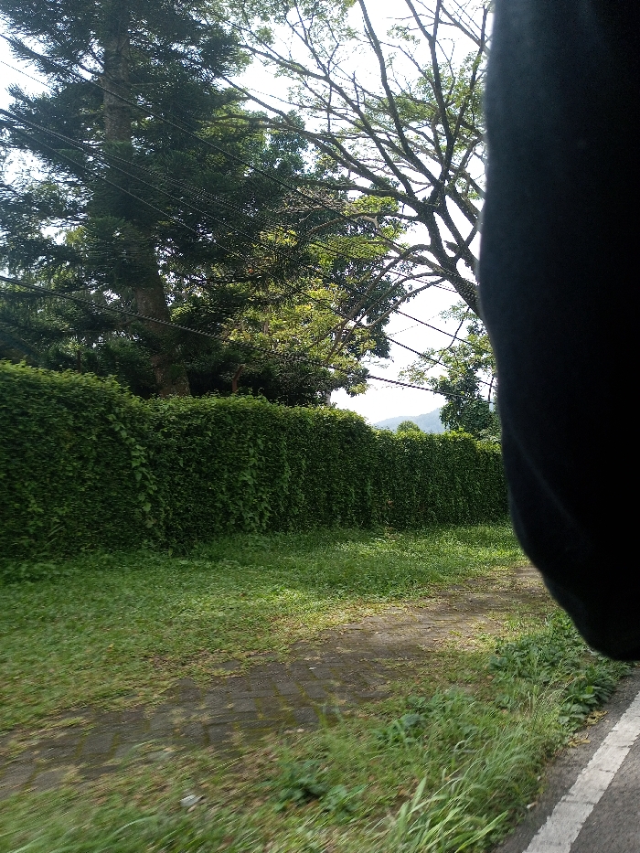 The image depicts an outdoor scene in Namthoung, Laos, viewed from a low angle, with a dark, out-of-focus object partially obscuring the right vertical portion of the frame. In the immediate foreground, a segment of dark paved road with a white line is visible on the bottom right, adjacent to a strip of green grass and weeds. A broader expanse of unkempt green grass with visible dirt patches extends across the lower-midground. A dense, uniform wall of green foliage, approximately 2-3 meters high, spans horizontally across the mid-ground, acting as a visual barrier. Above this foliage, large trees are visible against a bright, hazy sky: a tall coniferous tree with a robust trunk on the left and a large deciduous tree with a complex network of bare branches on the right. Multiple dark utility wires are strung horizontally across the upper portion of the scene, above the trees. Distant hills or mountains are faintly discernible in the far background beneath the sky. No human subjects or discernible actions are present.