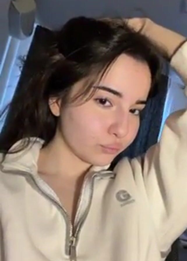 A young woman stands indoors, facing the camera with a serious expression. She is wearing a light-colored zip-up sweatshirt. She runs her right hand through her dark, shoulder-length hair, occasionally looking downwards. The background includes a window with blinds, a light fixture on the ceiling, and a curtain partially visible.