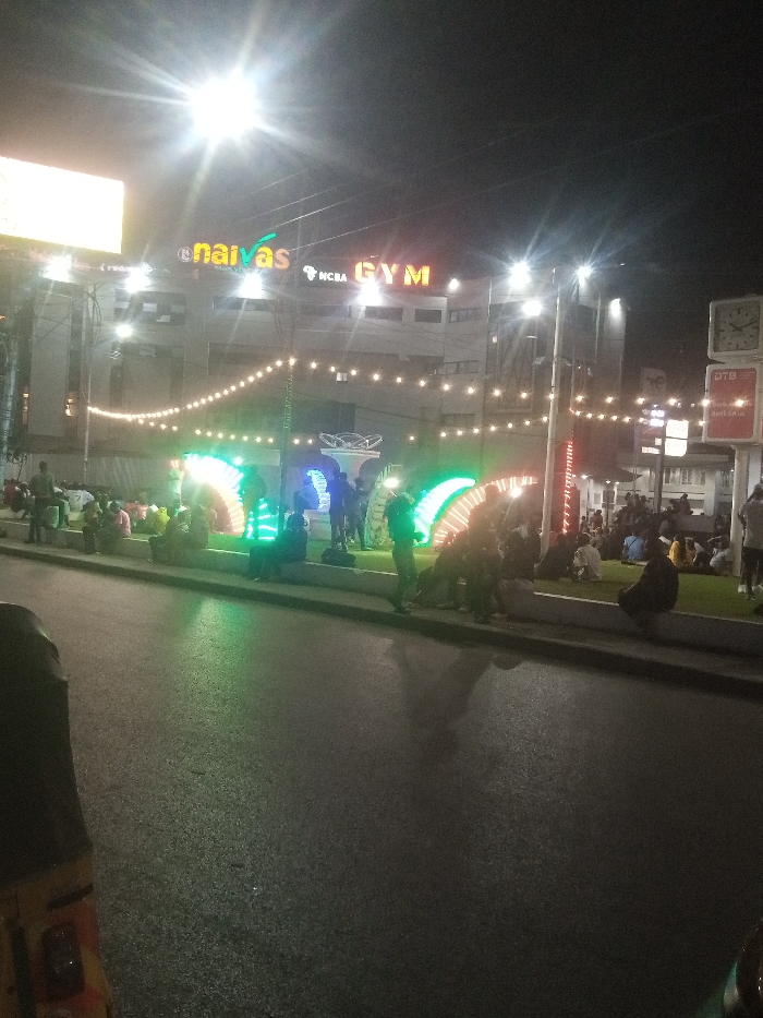 The image presents a nighttime street scene in Majengo ward, Kenya. In the foreground, a dark asphalt road is visible, partially obscured on the left by the front section of a yellow three-wheeled vehicle. Separating the road from a pedestrian area is a concrete median topped with green turf. Numerous individuals are congregated in this pedestrian space; many are seated on the median's edge or directly on the turf, while others stand. The area is brightly lit by string lights draped overhead, prominent streetlights casting significant lens flares, and several large, arched LED light installations emitting green and blue/purple light. In the background, a multi-story building features illuminated commercial signage, including 'naivas' and 'NCBA GYM'. To the right, a pole structure displays a square, dual-faced clock and a sign for 'DTB'.