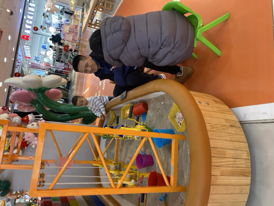 This image depicts an indoor children's play area located within a commercial establishment in Linghe, China. The scene focuses on a large, oval-shaped play pit with a wooden-paneled base and a padded brown rim. The pit contains a light-colored granular material, resembling sand or small pebbles, and features an orange metal framework structure with multiple yellow winch mechanisms, ropes, and various colorful plastic buckets (red, purple, blue) and yellow trays. Three individuals are present. A young child, appearing to be a boy, with short dark hair, wearing a horizontal blue and white striped long-sleeved shirt and blue pants, stands at the edge of the play pit, looking towards the left. To his right, an adult male with short dark hair, wearing a dark blue jacket over a lighter blue top and dark pants, is seated on a low wooden bench integrated into the pit's perimeter. He is smiling directly at the viewer. A smartphone rests on the bench next to him. To the right of the adult male, another adult, seen from behind, is seated on a bright green plastic child-sized chair. This individual is wearing a grey puffer jacket and dark pants. The background reveals a brightly lit retail environment with an orange floor marked with white lines. Large green and pink stylized flower sculptures are visible. In the distance, racks of clothing and display shelves are present, with a prominent sign reading "ABC KIDS" above a section of children's merchandise. Stuffed animals hang from an overhead structure above the play pit area. Other small wooden tables and chairs are visible further back within the retail space.