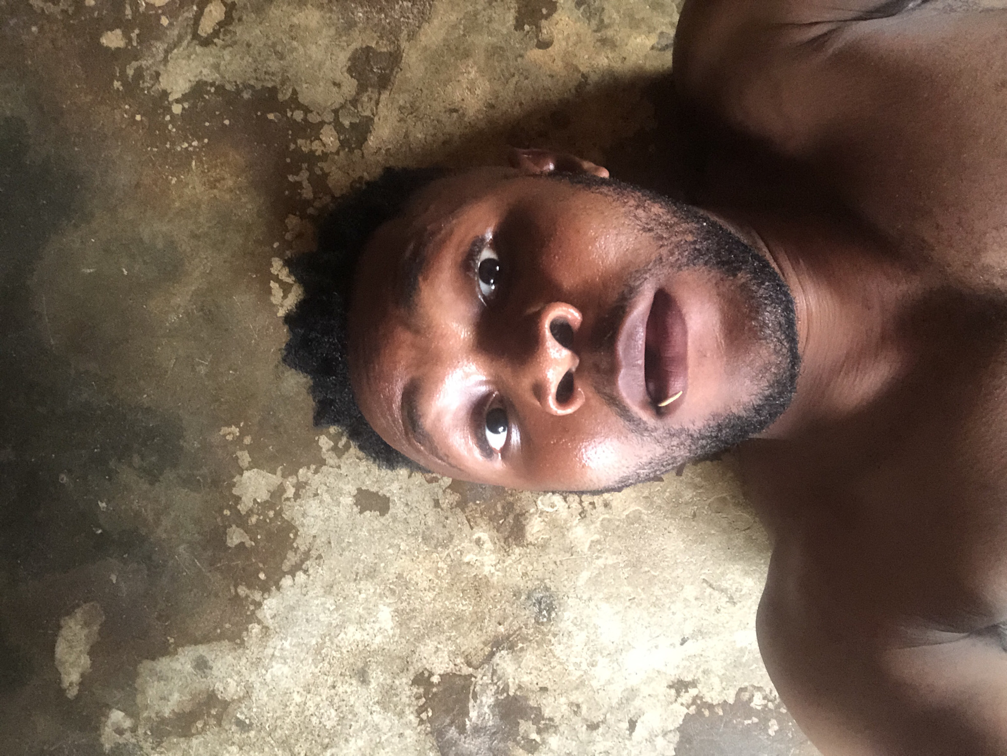 A close-up, ground-level, slightly angled image of a dark-skinned man with a short, dark, curly afro hairstyle and a close-cropped, dark beard. He has dark eyes and a gold ring in his left ear. He is lying on his back on a concrete surface with a mottled pattern of light and dark brown shades. His skin appears to be slightly sweaty. Part of his shoulders are visible. The location is Unknown, Unknown.