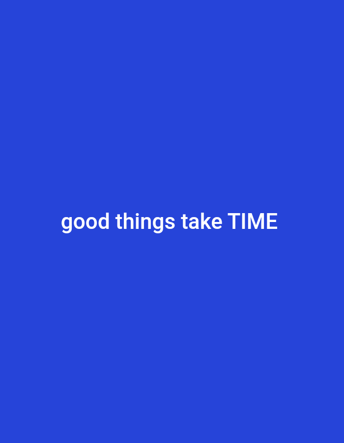 The image displays a solid, uniform blue background. Centered horizontally and vertically on this background is the text "good things take TIME" rendered in white, sans-serif font. The word "TIME" is capitalized. There are no other discernible subjects, objects, people, actions, or environmental features depicted. The specific location within "Unknown, Unknown" cannot be determined from the image content.