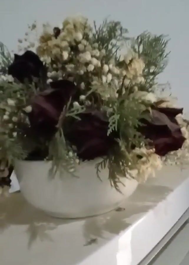 close-up of a floral arrangement in a white bowl, set on a white surface. The arrangement consists of dark red roses, baby's breath, and green foliage. The background is a plain white wall. The camera slowly zooms in and out on the arrangement, keeping it in focus.