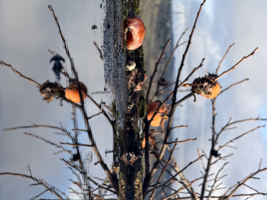 The image depicts an outdoor, low-angle scene captured in Freixo de Espada à Cinta, Portugal, under natural daylight conditions. The foreground features a still puddle of water, occupying the lower half of the frame, which clearly reflects leafless tree branches and orange fruits from above. Small ripples and a solitary metallic-appearing spherical object are visible on the water's surface. The immediate edge of the puddle consists of dark, wet soil or mud mixed with small particles and organic debris. Resting on the damp ground to the left of the puddle is a single, reddish-orange fruit, consistent with a decaying persimmon, exhibiting a distinct cavity or bite mark on its visible side. Further back on the ground, additional dark organic detritus is scattered. Emerging from the ground and extending upwards and across the frame are numerous thin, brown, deciduous branches, indicating a colder season. Two additional bright orange fruits, also consistent with persimmons, hang from these bare branches. The fruit positioned in the upper-left quadrant appears partially consumed or decayed, with dark fibrous material attached. Another persimmon is visible further to the right, appearing more intact. The background presents a blurred, distant landscape beneath a partly cloudy sky, showing a mixture of pale blue and grey hues. Faint, vertical, indistinct structures, possibly utility poles or transmission towers, are subtly visible on the horizon. No human subjects or discernible actions are present in the scene.