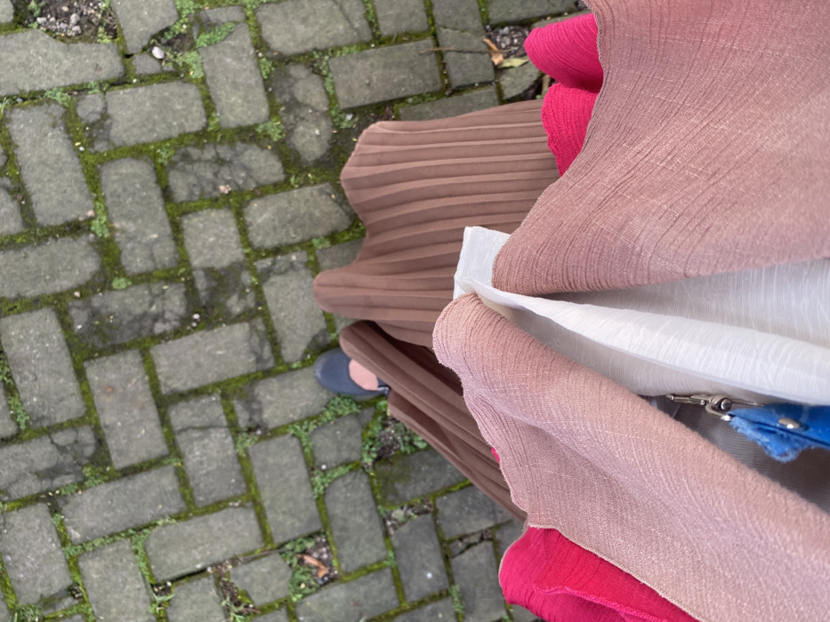 The image presents a high-angle, downward view of a person's lower body and feet on a paved outdoor surface. The ground is composed of grey rectangular concrete pavers arranged in a herringbone pattern, with green moss and sparse vegetation growing within the cracks. The individual is wearing a dark blue or black closed-toe shoe, visible on the left foot. They are dressed in a pleated, brown-colored long skirt or wide-leg trousers. The person is holding or carrying several textile items directly in front of them, positioned prominently in the foreground. These fabrics include a central white, textured material, flanked by two pieces of dusty rose-colored, textured fabric, and further out, two sections of bright magenta fabric. A silver-colored metal clasp and a small blue fuzzy object, possibly a keychain or charm, are visible among the held fabrics. The specific location within "Unknown, Unknown" is an exterior paved pathway.