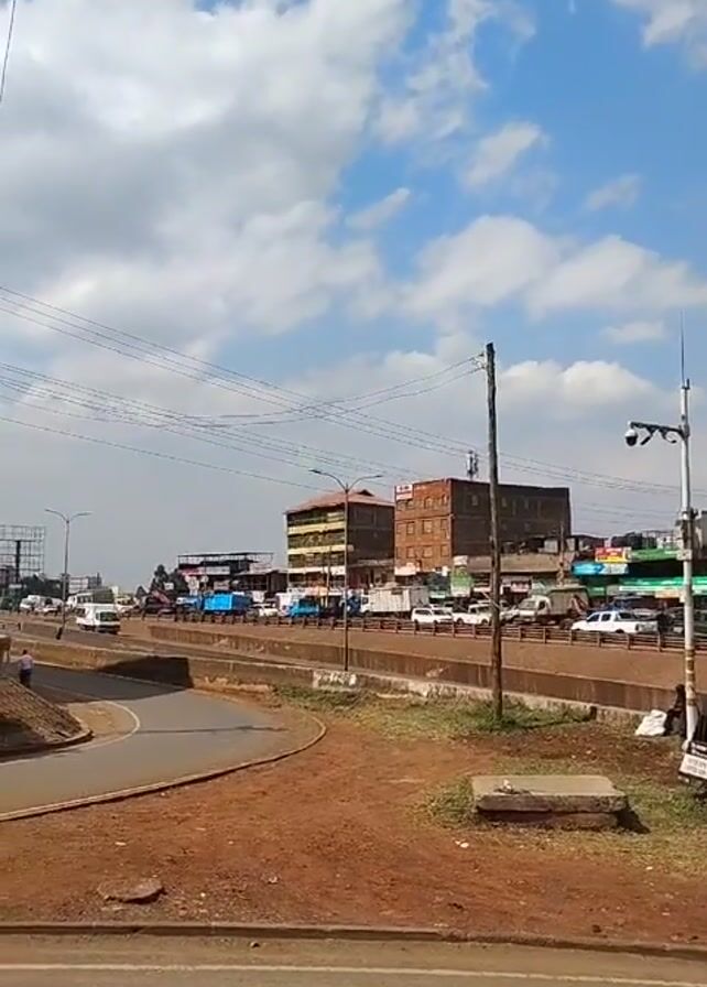 The video presents a daytime view of a busy road in what appears to be an urban setting. The road is congested with various vehicles, including cars, vans, and trucks. The background features several buildings of varying heights, some of which are painted in bright colors like yellow. Utility poles with wires stretch across the sky, partially obscuring the view of the cloudy blue sky above. The foreground shows a roadside area with red soil and sparse vegetation. A section of a roundabout is also visible, leading onto the main road. A security camera is mounted on a pole. The overall impression is of a bustling commercial area with moderate traffic.