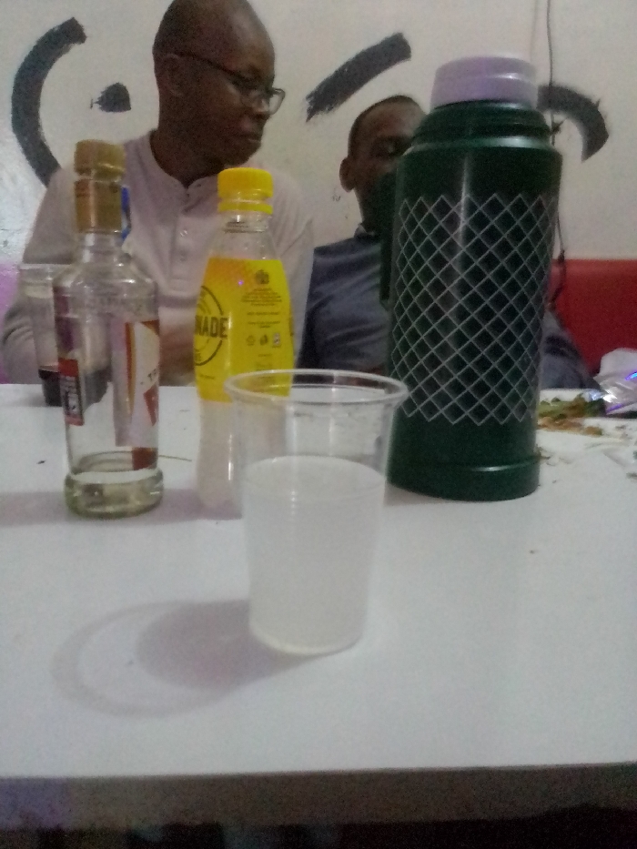 The image depicts an indoor scene in Kinoo ward, Kenya, featuring two adult males seated at a white table. In the foreground, a clear glass bottle with a gold-colored cap, approximately one-quarter full of clear liquid, is positioned on the left. Its label shows red and white markings. Behind it, a clear plastic cup containing a dark liquid is partially visible. To the right of the glass bottle stands a yellow plastic bottle with a yellow cap, labeled "LEMONADE", appearing nearly full. In front of the yellow bottle, a clear plastic cup, largely empty, casts a shadow on the table. Further right, a dark green thermos bottle with a light purple cap and a diamond-patterned texture is present. Scattered debris, resembling food remnants and a crumpled reflective object, are visible on the table to the right of the thermos. In the background, an adult male with a bald head and glasses, wearing a light-colored shirt, is partially visible on the left, looking downwards. An indistinct portion of another adult male in a darker shirt is visible on the right, largely obscured by the thermos. The background wall is light-colored and features dark, abstract, curvilinear markings. A red upholstered surface is visible on the far right. The scene is illuminated by an artificial light source, casting shadows from the objects on the table to the left. No direct interaction between the individuals or with the objects is overtly depicted beyond their presence in this setting.