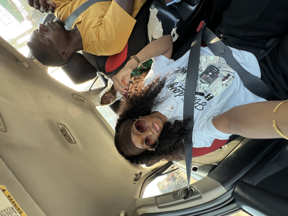 A car interior shows three individuals. In the driver's seat, a person in a white shirt with a graphic and brown headband, wearing rose-tinted glasses, has a seatbelt on. In the back, a person with a white patterned hood looks towards the front, while another person in a yellow shirt is angled away, also wearing a seatbelt. The interior is tan, and a yellow warning sticker is visible on the left. Sunlight streams into the car through the windows.