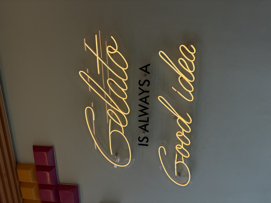 The scene is an interior view of a light teal-grey wall at Gelato Artigianale, located at Carrera 11 # 84 - 09, Bogotá, Colombia