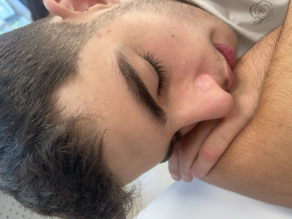 One individual, appearing to be a young adult male, is depicted in an indoor setting. The subject has dark, short hair with a faded cut on the sides, prominent dark eyebrows, and visible stubble on the cheeks and upper lip. Their eyes are closed, with distinct eyelashes visible. The subject's head is tilted downwards and rests upon their left hand, which is curled with fingers supporting the jaw and chin area. Minor skin blemishes are present on the right temple and cheek. A light-colored garment, possibly a t-shirt, is partially visible on the subject's right side, featuring a faint, light-grey circular graphic. The background is uniformly light and featureless, indicative of an unidentifiable interior space. The specific location in the city of Unknown, Unknown, cannot be determined from the image.
