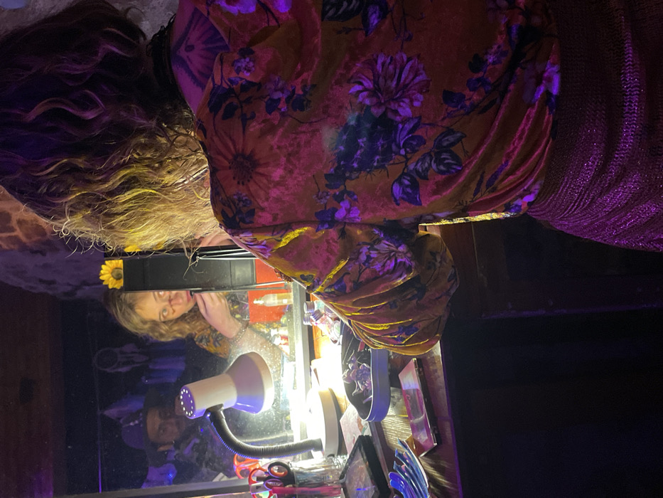 A person with long, wavy hair stands beside a glass-topped table. A sunflower adorns their hair. The table holds a lamp, scissors, and various items, possibly art supplies. A reflection of the person appears on the glass surface. The person wears a brown floral dress and a sparkling top. The lighting casts purple hues on the walls and the person's hair.