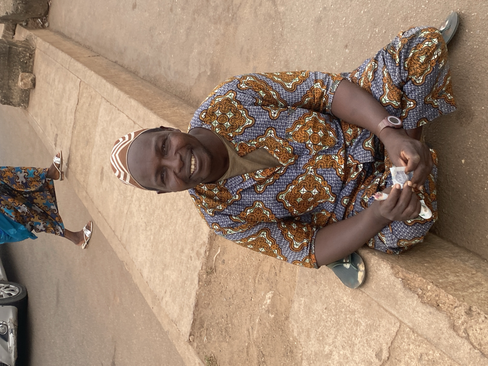 A woman is sitting on a low concrete wall in Sabon Tasha, Nigeria. She is wearing a patterned top and pants, with a matching cap. In her hands, she holds some money. She is smiling and looking directly at the camera. A second person is walking away in the background and a car is parked nearby. The scene appears to be outdoors, near a street.