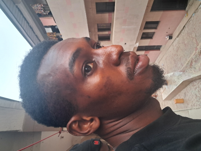 A man gazes upward, his head tilted back against a backdrop of urban structures. His dark, close-cropped hair frames his face, and his facial features are well-defined – from his dark eyes and prominent nose to his full lips and a neatly trimmed beard. He wears a black shirt. The surroundings suggest an outdoor location, with architectural details of buildings visible in the background, including windows and neutral-colored facades.
