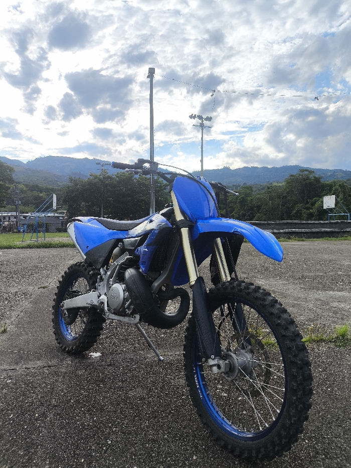 - "A blue and black Yamaha YZ-series dirt bike (motocross motorcycle) is parked on a dark gray paved surface, leaning slightly to its left on its deployed kickstand" by FM-vAzZg2, licensed under CC BY 4.0