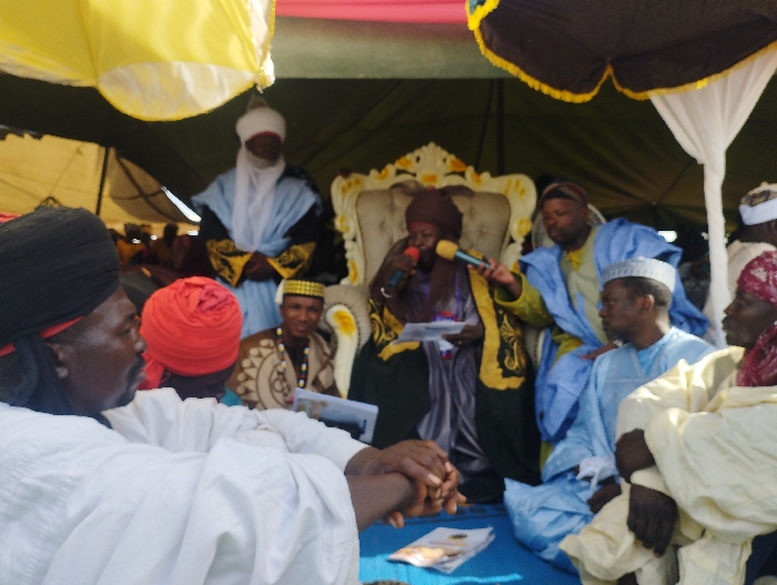 gathering of men in a large tent, possibly a public space or a traditional event, located in Chum, Nigeria (coordinates: 9.706, 11.713). The men are dressed in traditional attire, with many wearing turbans and long, flowing robes. A man in a black robe and a turban is speaking into a microphone, while another man in a white robe and a turban sits on a ornate throne. Several others are seated around them, listening intently. The environment is a mix of traditional decor, with colorful fabrics and patterned carpets. An awning draped over the tent provides shade from the bright sunshine outside.
