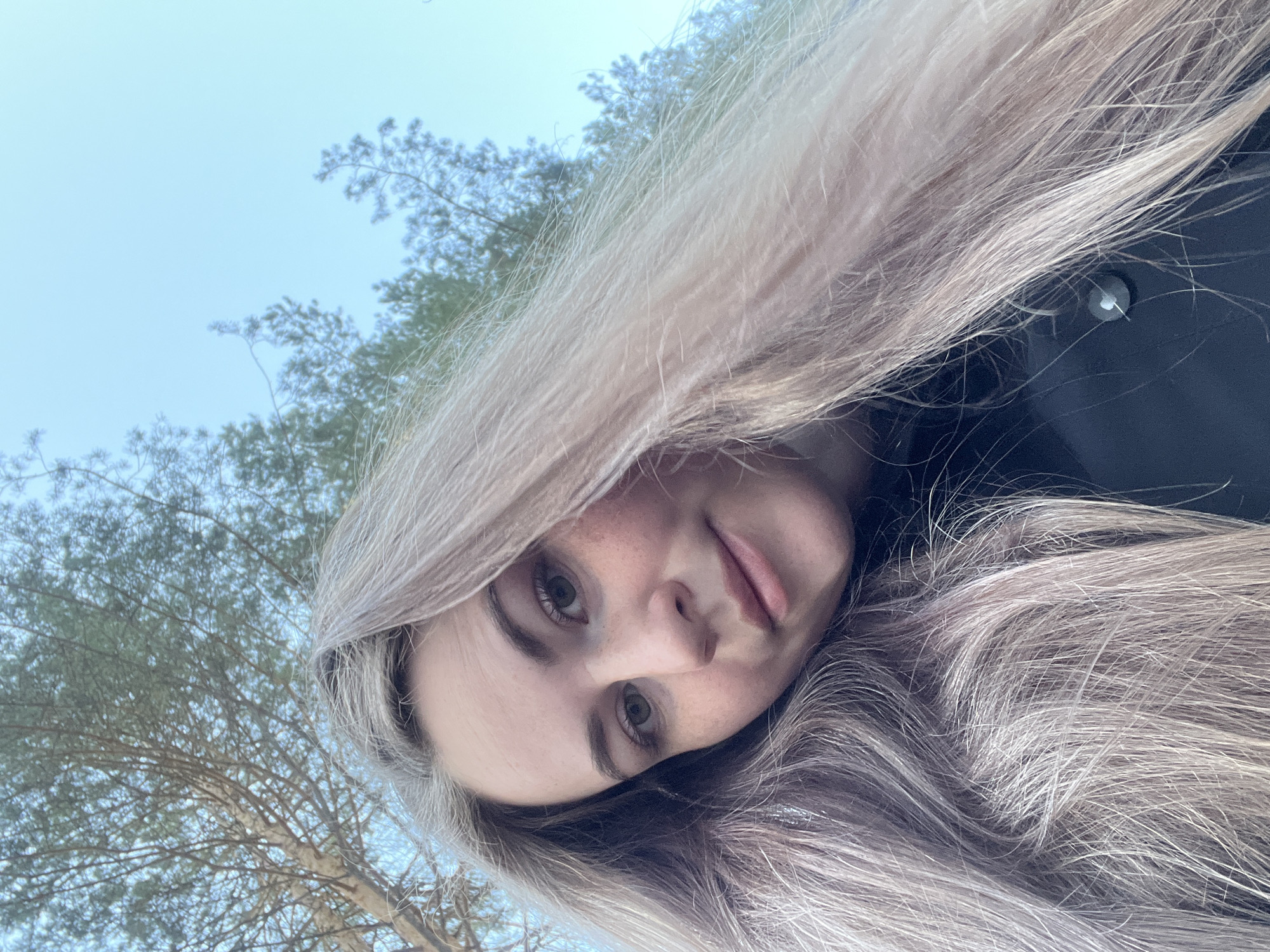 A young woman with long, light blonde hair is pictured in a close-up selfie