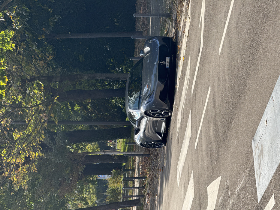 A dark grey Maserati MC20 Cielo convertible is parked at an angle on the shoulder of an asphalt road in Strasbourg, France