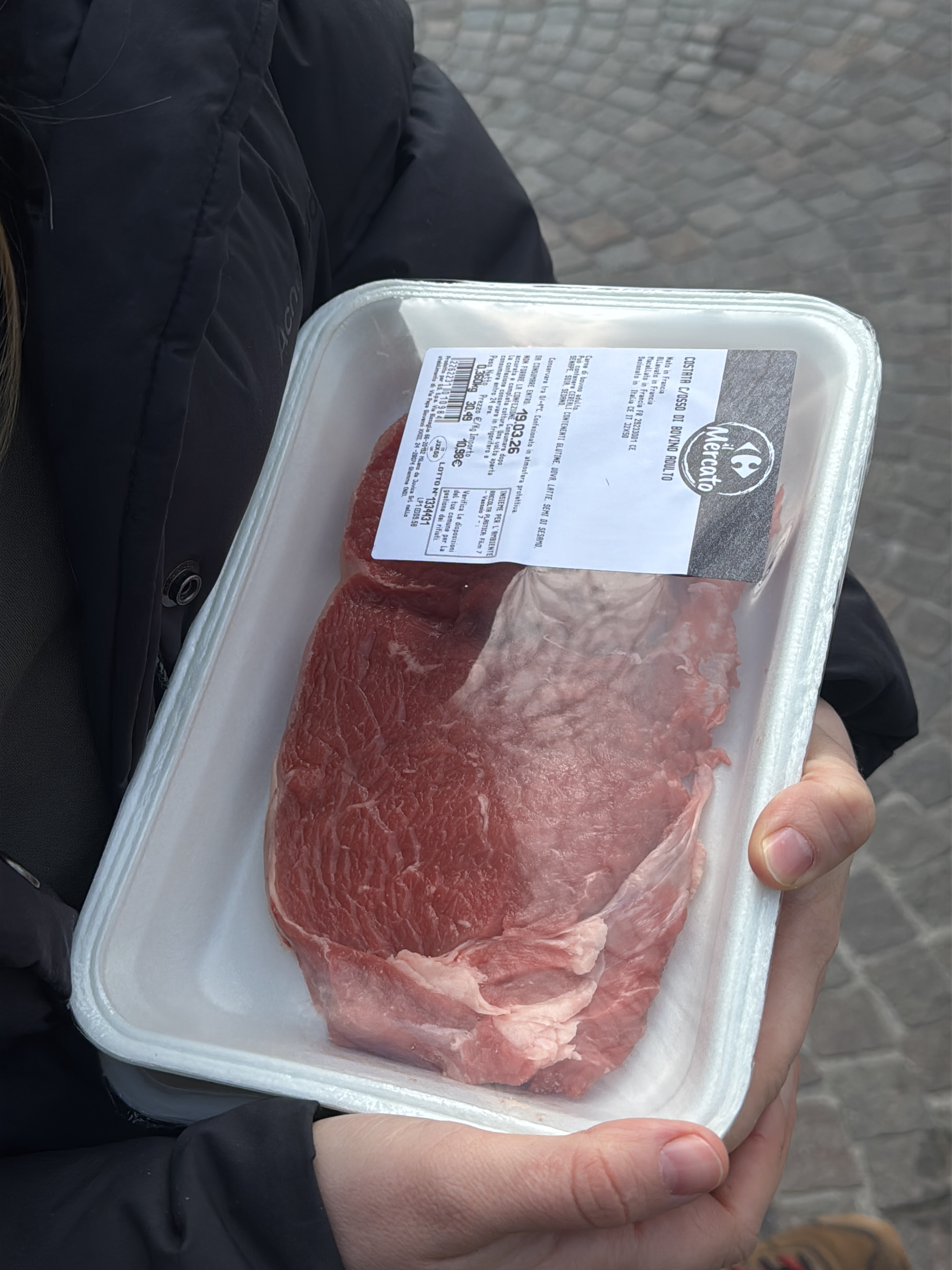 An individual, wearing a dark jacket, holds a white styrofoam tray containing a raw cut of red meat, sealed with clear plastic wrap. A white label with the "Carrefour Mercato" logo is affixed to the package, displaying text in Italian, including "BOVINO ADULTO" (Adult Bovine), "FILETTO" (Fillet), a weight of 260g, a total price of 3.61€, and a packing date of March 9, 2023. The background consists of a greyish-brown cobblestone pavement, indicative of an outdoor urban environment in Como, Italy.