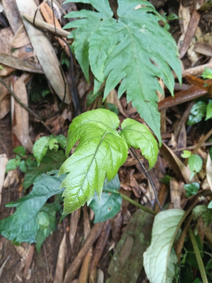 The image captures a close-up, ground-level view of natural vegetation, identified as being in Situm, Papua New Guinea. The central focus is a cluster of three vibrant, glossy green leaves, appearing fresh and possibly damp, characterized by prominent venation and irregular, shallowly lobed margins. Positioned above and slightly behind these, a larger, darker green leaf with more deeply serrated or lobed edges is partially visible. The surrounding ground cover is composed of a dense accumulation of various brown and tan organic materials, including dried leaves and elongated plant matter consistent with bamboo sheaths, intermingled with dark, moist soil. Smaller green and paler colored leaves are scattered throughout the foreground and background. No individuals, animals, or man-made objects are present in the frame. The scene depicts a humid, natural forest floor environment.