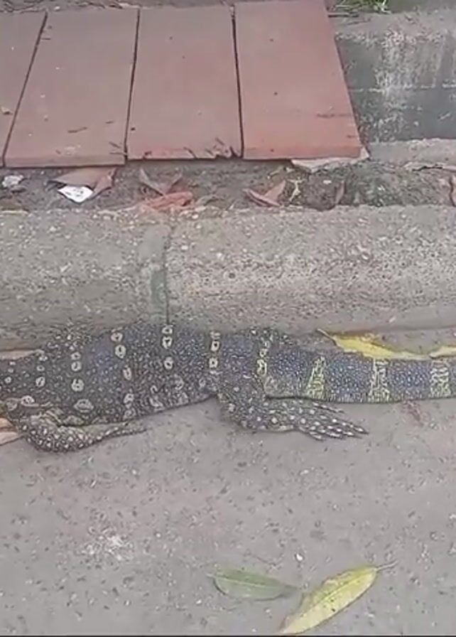 A wide shot shows a monitor lizard lying motionless on a paved road next to a concrete curb