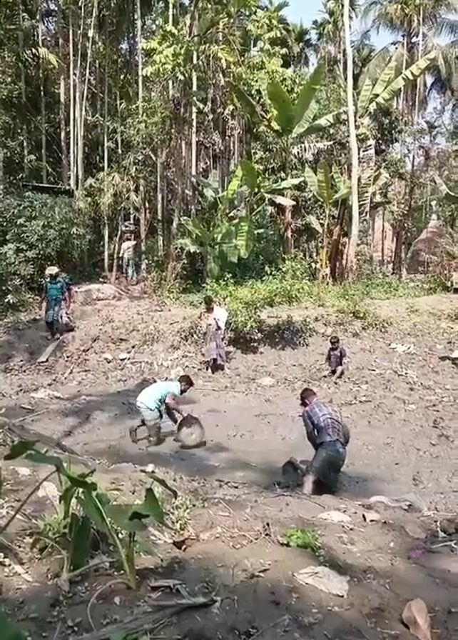Several people are in a muddy area, likely a dried-up pond or wetland, digging and searching through the mud. Two individuals are prominently kneeling and digging with their hands, one using a small metal container. Others are standing nearby, also appearing to be involved in the activity. The setting is rural, with trees, including bamboo and banana trees, surrounding the muddy area. The scene is bright and sunny.