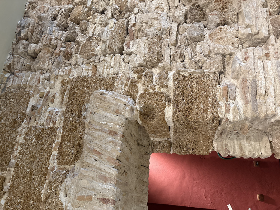 The image depicts a detailed section of an ancient masonry wall and an arched passageway within the Roman Theatre of Cádiz, Spain. The primary wall is constructed from a mixture of irregularly shaped, light-colored, porous stone (consistent with 'piedra ostionera' common to the region) and reddish-brown bricks, all bound by light-colored mortar. The texture is varied, with some sections showing more uniform brickwork and others exhibiting larger, rough-hewn stone blocks. On the left side, a prominent archway is visible, framed by light-colored bricks set in an angled pattern to form the curve. This arch opens into an interior space characterized by a vibrant, solid red-painted wall. Within this red-painted area, near the lower left of the arch opening, a thin green flexible conduit or wire is partially visible. Further to the left on the red wall, two small, rectangular, light-colored fixtures (possibly electrical outlets or interpretive panels) are mounted vertically. The ceiling above the ancient wall is a plain, light-colored surface. No people are present, and no specific actions or interactions are depicted. The scene highlights the architectural materials and construction techniques of the historical structure.