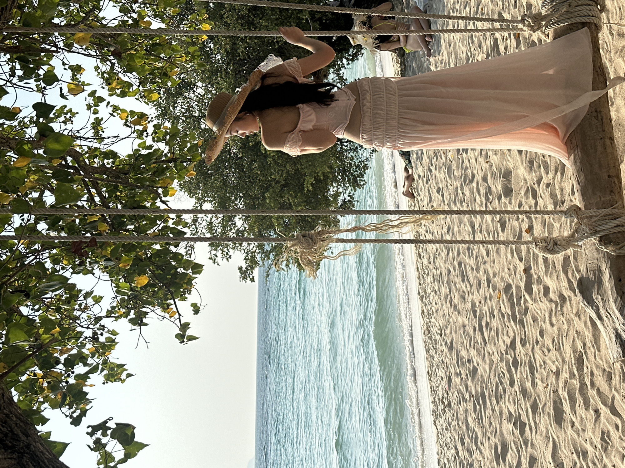 A woman with long black hair wears a straw hat and a pink dress on a rope swing suspended between a tree and a wooden beam on a sandy beach