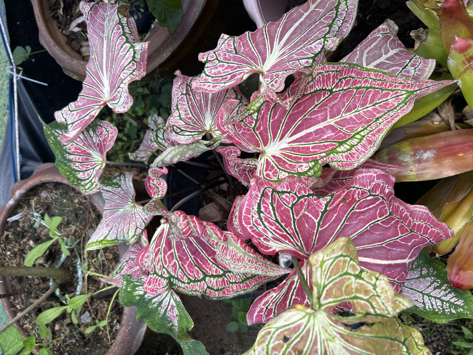 This image depicts a vibrant cluster of variegated Caladium plants situated in the city of Ko Tao, Thailand. The scene is dominated by numerous large, heart-shaped leaves exhibiting a striking magenta-pink coloration across their main surface, intricately detailed with prominent white and green venation. The leaf margins are frequently bordered with green. Several leaves display a slightly undulating or curled texture. These plants are contained within various pots: a brown, terracotta-style pot in the upper left holds a smaller plant with a visible woody stem and green shoots, another similar pot is partially visible in the upper right, and a portion of a pink pot appears along the right edge. Dark soil is visible as the planting medium. Towards the bottom of the frame, additional reddish-brown plant stalks and green foliage are discernible. The environment appears to be an outdoor garden or nursery setting under natural illumination. No individuals, direct actions, or interactions are depicted within the frame.