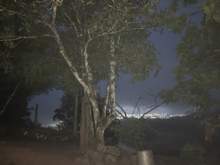 Night scene reveals a distant cityscape twinkling with lights, partially obscured by silhouetted trees. The foreground is dark, with a dirt path and some low-lying structures or vegetation. A cluster of tree trunks stands prominently, with branches reaching upwards. The sky is a deep blue-gray, suggesting a late evening or early morning atmosphere. The overall impression is one of tranquility and a vantage point overlooking a populated area.