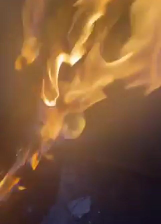 close-up view of flames rising upwards. The flames are bright orange and yellow, and they flicker and dance in a chaotic manner. The background is dark, and only a few hints of the ground are visible. The camera is shaky, suggesting it is being hand-held. There are no people visible in the frame. A small white object appears to be sitting on the ground.