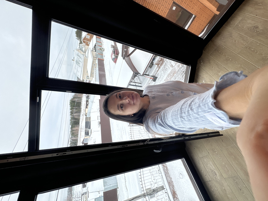 A young adult female with dark hair and wearing a light blue, long-sleeved, button-up garment stands indoors on a light wood-plank floor, holding a camera at arm's length to capture a selfie. She is positioned within a room featuring large, dark-framed windows that offer an expansive view of a snow-covered residential area in Vysokinichi, Russia. The outdoor scene, under an overcast sky, depicts a winter landscape. Snow covers the ground, roofs of various houses, and vegetation. In the immediate foreground, outside the window, is a dark metal fence. Beyond this, a snow-covered street or pathway is visible. Several single-family homes are scattered throughout the mid-ground, featuring different architectural styles, some with lighter-colored facades and others with visible brickwork (to the far right, possibly an extension of the viewing structure). A red vehicle is partially visible, parked and covered in snow in the mid-ground. Further in the background, a dense line of coniferous trees marks the edge of the residential area. Overhead power lines traverse the sky. A shovel leans against a structure just below the window on the left side of the frame.