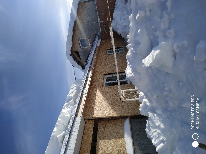 The image depicts an outdoor winter scene in Гаревая, Russia, under a clear blue sky with faint wispy clouds. The ground in the foreground and around the structures is covered in large, irregular mounds of white snow. On the left, a building with exterior walls composed of oriented strand board (OSB) panels features several white-framed windows and a prominent white ornamental metal railing. Its roof is heavily laden with a thick, white layer of accumulated snow, forming a distinct cornice. To the right, a second, partially visible building, with a darker roof also covered in snow, shows a single square white-framed window on its visible side. Strong sunlight illuminates the scene, casting reflections, particularly off the right-hand building. No individuals are present.
