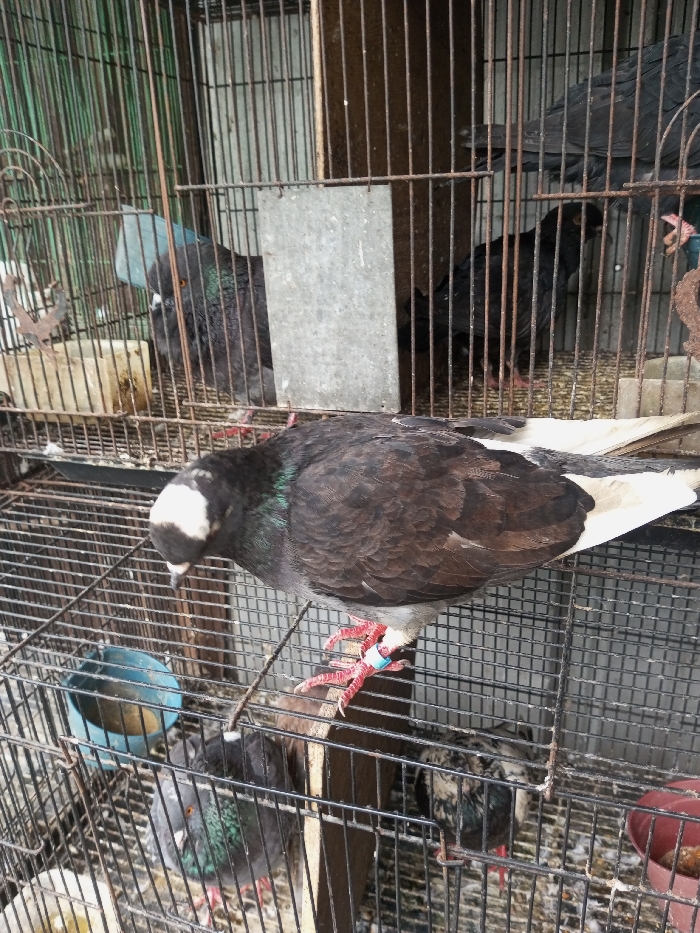 A group of pigeons are confined within metal cages. Predominantly gray-brown plumage is visible, with patches of black and white on some. Red feet and a blue band on one pigeon stand out. One pigeon has a distinctive white patch on its head. Cages contain food and water in metal and blue plastic dishes. The setting implies they are kept in close proximity.