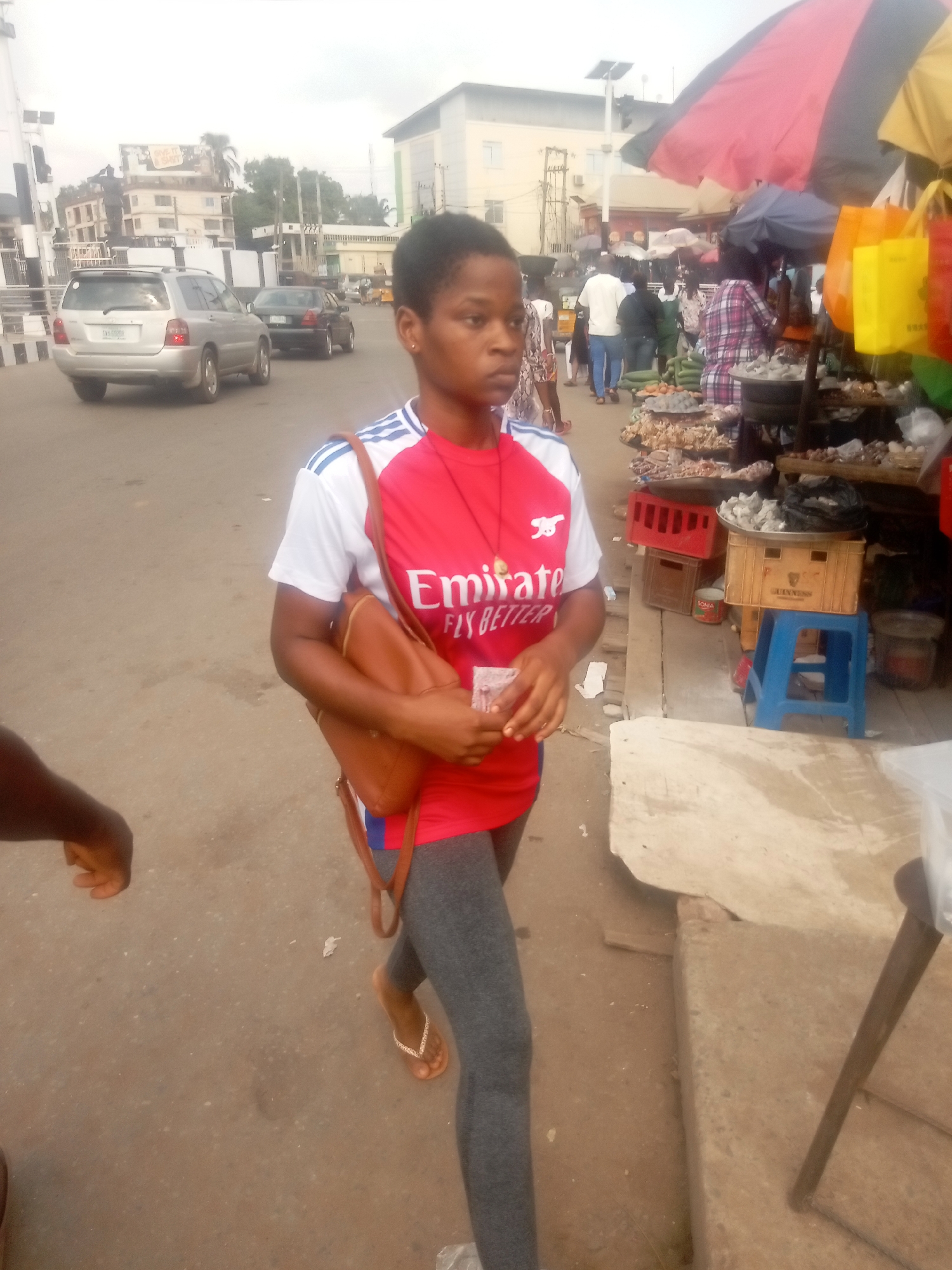 This image depicts a daytime urban street scene in the city of Unknown, Unknown, characterized by a bustling market environment on the right and vehicular traffic on the left, under an overcast sky. A young adult female, approximately late teens to early twenties, is the primary subject, walking diagonally from the lower-left to the central-right of the frame. She has short, dark hair and wears a red and white short-sleeved t-shirt with "Emirates FLY BETTER" and an Arsenal FC crest, dark grey leggings, and beige flip-flops with embellishments. A light brown shoulder bag is worn across her body, and she holds folded currency in her left hand. A small pendant hangs from her neck. Her gaze is directed slightly to the right of the frame. The partial arm and hand of another individual are visible in the extreme lower-left foreground. To the right, a makeshift market stall is set up on a raised concrete sidewalk. It is shaded by a prominent red and black striped umbrella, from which yellow and orange shopping bags hang. Various goods are displayed on wooden and plastic crates (including one labeled "GUINNESS") and trays, supported by a blue plastic stool. Visible items include fresh produce such as cucumbers and eggs, alongside what appears to be shellfish or small seafood. Indistinct figures are visible interacting within the market area in the midground. On the paved road to the left, a silver Toyota Highlander SUV with a partially visible license plate ("OG 264...") moves away from the viewer, followed by a dark-colored sedan. Street light poles or traffic signal structures are present on the far left. In the background, several multi-story buildings, some light-colored, line the street. A large billboard sign with partially legible text ("GIVE IT A...") is visible above the buildings and trees. The road surface is asphalt, and the concrete sidewalk shows minor wear and scattered debris.