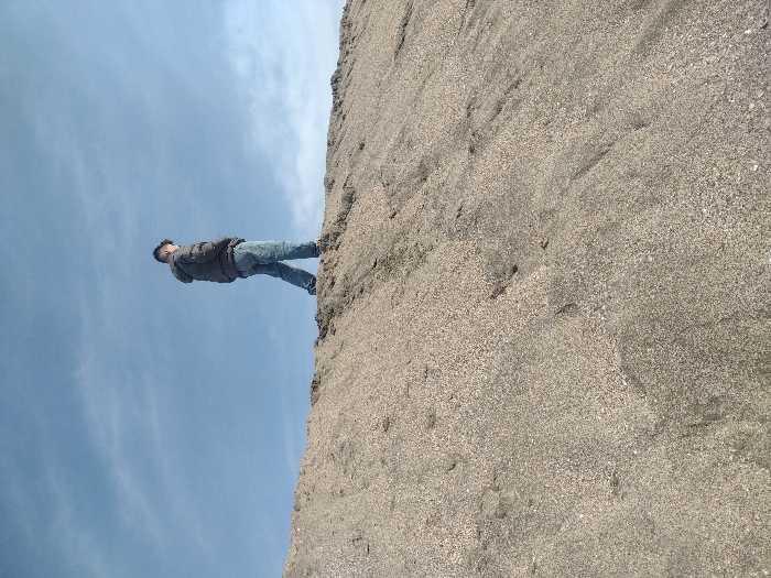 The scene is located in Burgas, Bulgaria. A single male individual stands on the crest of a substantial sandy mound, viewed from a low angle. The subject wears a dark, hooded puffer jacket, blue denim trousers, and dark shoes. He is oriented with his back partially towards the camera, with his head tilted downwards and to his right. The ground beneath and in the foreground consists of coarse, light brown-grey sand, visibly mixed with small white shell fragments or pebbles, forming an uneven, sloping surface. The upper two-thirds of the image depict a clear blue sky with minimal, scattered white clouds. No other individuals or specific landmarks are discernible.