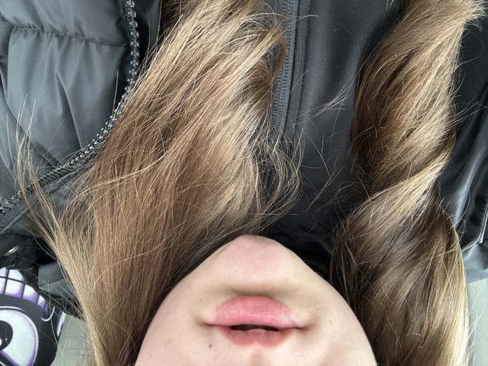The scene is observed within Oploo, Netherlands. The image presents a close-up, chest-up view of an individual, focusing primarily on their lower face, hair, and upper torso. The person's lips are slightly parted, exhibiting a natural pink hue. A small, dark nevus (mole) is visible on the skin superior to the left labial commissure. The chin is smooth and rounded. Long, wavy, light brown hair, varying in tone, flows over the shoulders and chest, partially obscuring a dark, likely black, padded jacket. A vertical black zipper is visible on the jacket's right side. The background is out of focus, revealing a blurred purple, white, and black graphic pattern resembling an eye and a portion of a mouth with teeth, positioned behind the subject's right shoulder. No active interactions or specific actions are depicted.