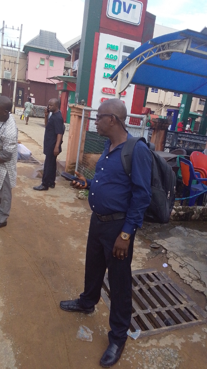 The image captures an outdoor urban scene in Onitsha, Nigeria, alongside a street or thoroughfare. In the immediate foreground, an adult male with a bald head and glasses, dressed in a navy blue long-sleeved button-down shirt, dark trousers, and black loafers, stands facing towards the right side of the frame. He carries a black backpack and holds a dark-colored smartphone in his left hand. A gold-toned wristwatch is visible on his left wrist. Adjacent to his right foot is a metal drainage grate embedded in the ground, which consists of dirt and some cracked pavement. Further back, towards the left of the frame, a second adult male with a bald head, wearing a dark suit or dark shirt and trousers, holds a dark-colored phone to his ear, appearing to be engaged in a call. A third individual, partially visible on the far left, wears a light-colored patterned shirt. The background features a prominent red and white gas station sign displaying the "OVL" logo at the top. Below the logo, various services and fuel types are listed: "PMS," "AGO," "DPK," "LP," "MINI-MART," and "POS." A blue, arched canopy structure is visible over part of the gas station area. Near the station, a cluster of red, blue, and green plastic chairs is present. To the left of the gas station, a distinctive two-story building with a pink facade and a grey gabled roof stands, accompanied by other multi-story buildings and utility poles with overhead wires. A woman in a light-colored dress carrying a yellow bag is seen walking in the far background on the left.