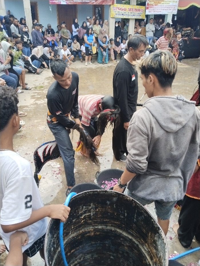 The image depicts an outdoor scene in Kerjo, Indonesia, featuring a traditional performance event. The ground is a wet, paved surface scattered with red and pink flower petals. A large crowd of onlookers, comprised of men, women, and children, is visible in the background, seated and standing against a building facade adorned with banners. One prominent banner reads "SINGO MUDHO." In the mid-ground, four men are engaged in activity. From left to right: 1. A young male with dark curly hair, wearing a white t-shirt with a "2" on the back, holds a blue hose directed into a large, dark, metallic barrel in the foreground. 2. A man with short dark hair, wearing a black long-sleeved shirt with an Indonesian flag armband and dark jeans, is bent over. He is actively pulling or washing a long, dark, horsehair-like object from a black plastic bucket containing water and flower petals. A white and black prop, resembling a stylized horse's body from a *kuda lumping* costume, lies on the ground near his feet. 3. An older man with short dark hair, wearing a black long-sleeved shirt with an Indonesian flag armband and dark pants, stands upright, observing the scene. 4. A young man with light-colored, styled hair, wearing a grey hooded sweatshirt and denim shorts, stands with his back mostly to the camera. He holds a lit cigarette in his right hand and has his left hand submerged in a second black plastic bucket filled with water and flower petals. Partially obscured between the bent-over man (2) and the observing man (3) is a figure in a red and white striped shirt and dark pants, with a dark, ornate headpiece featuring long hair, indicating a performer or prop associated with traditional Indonesian *Kuda Lumping* or *Jathilan* rituals. The overall scene suggests a post-performance or ritualistic cleansing activity.