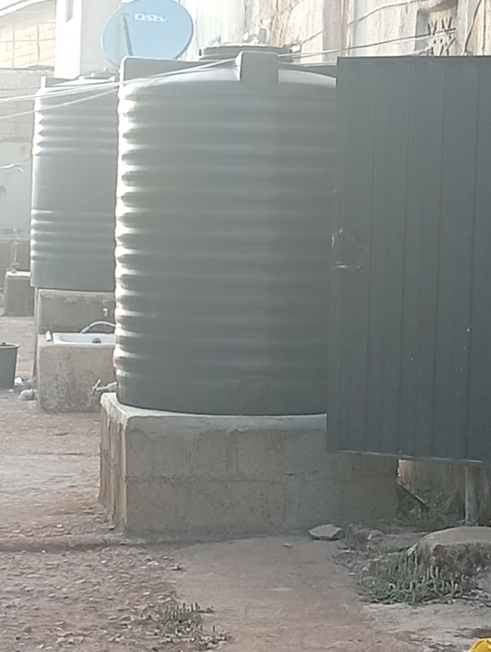 several large, black water storage tanks standing on concrete bases in an outdoor area. A blue satellite dish sits atop one of the tanks. A dark-colored wall or fence partially obstructs the view on the right side of the frame. The ground is mostly dirt with some sparse vegetation. The tanks appear to be located in a residential or commercial area, based on the surrounding buildings.